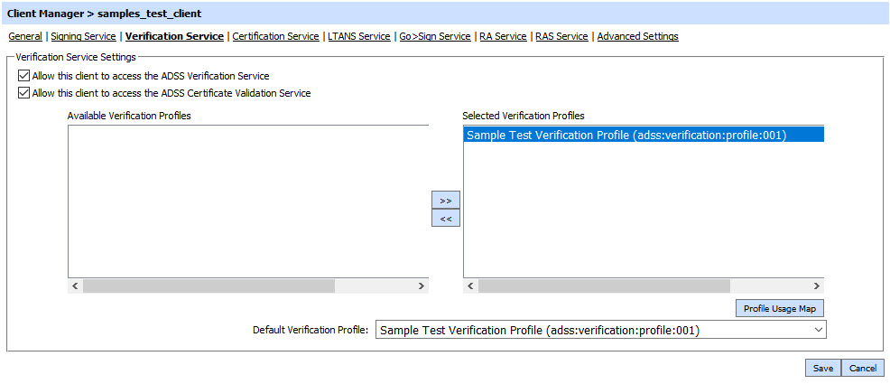 The next action is to define which verification profiles (configured within the ADSS Verification Service) are to be made available to this client. Different clients may need to have access to different verification profiles. By default all the existing verification profiles currently configured within the ADSS Verification Service will be made available to each newly registered client. In order to allow access to a particular verification profile, simply move that profile from the left-hand group box labelled Available Verification Profiles to the right-hand group box labelled Selected Verification Profiles using the >> button shown in the screenshot above. Clients can only reference those verification profiles that are shown in the Selected verification Profiles. To remove access to a particular profile use the opposite << button to move the relevant profile back to the right-hand box.