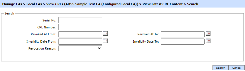 The contents of a CRL can be searched by clicking the Search button. This will show the following options for searching for a particular certificate in the target CRL:
