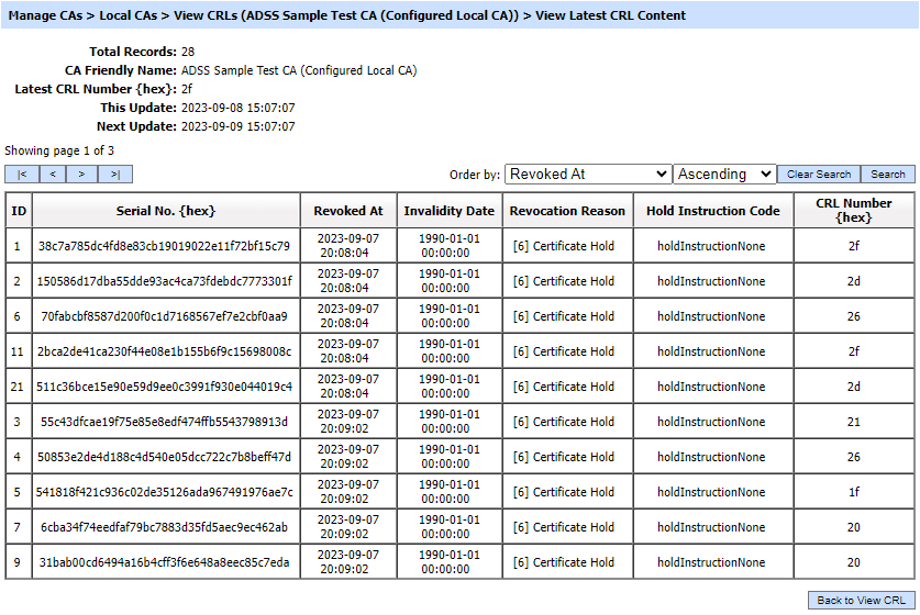 The records in the latest CRL for a particular CA can be sorted in either Ascending or Descending order by selecting a table column from the drop down list.
