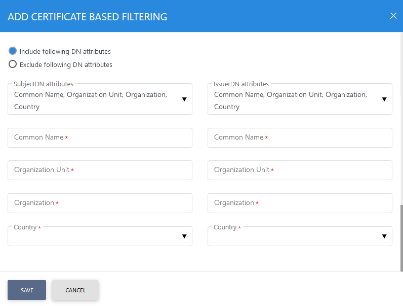 Choosing the option Allow access based on TLS Client Certificates or Allow access based on requests being signed and clicking + button will show the following screen where filtering can be performed based on Issuer or Subject DN Attributes: