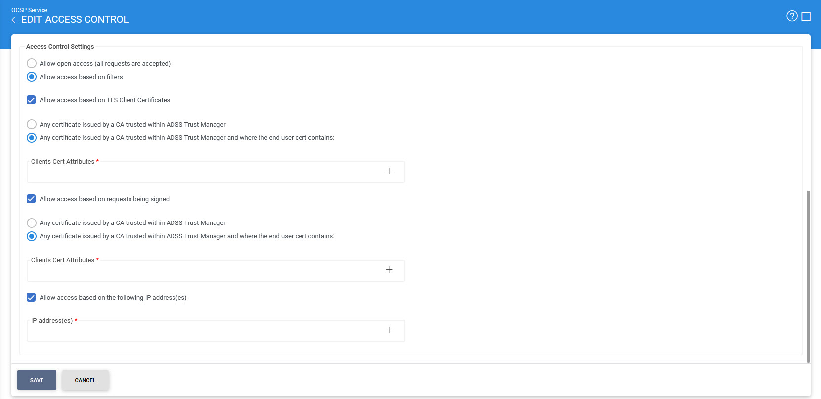 The OCSP access control module allows you to restrict the access of OCSP service based on the following options: