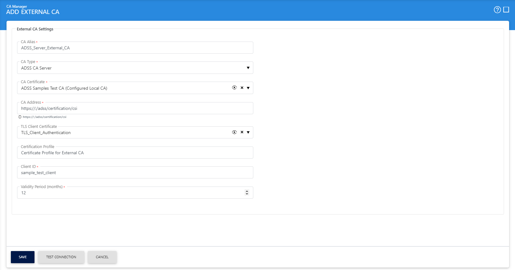 To configure the ADSS Server CA as an external CA select the ADSS CA Server from the CA Type drop down. The following page will be shown to configure the ADSS CA Server: