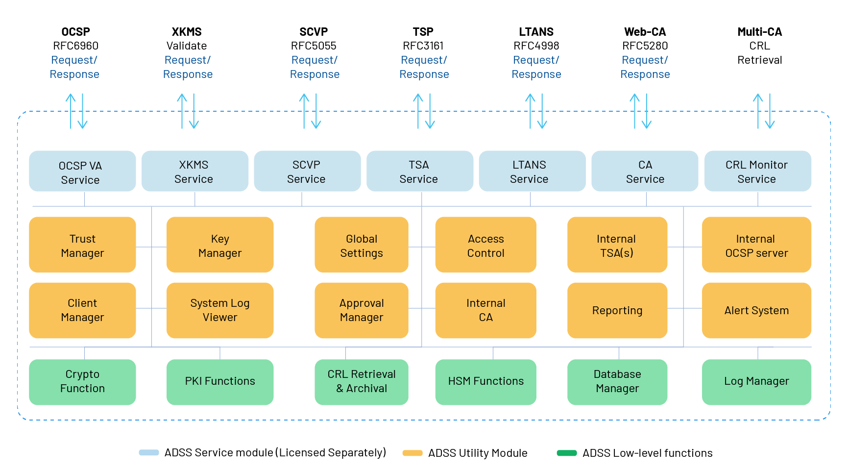 The above figure shows how the ADSS Service modules (shown in blue) provide trust services to external applications. Utility modules (shown in brown) are lower-level modules which provide their services to the service modules. There are additional lower-level modules and components shown in green which provide underlying generic functionality to the higher modules. Each of the modules is described in detail later in this manual.