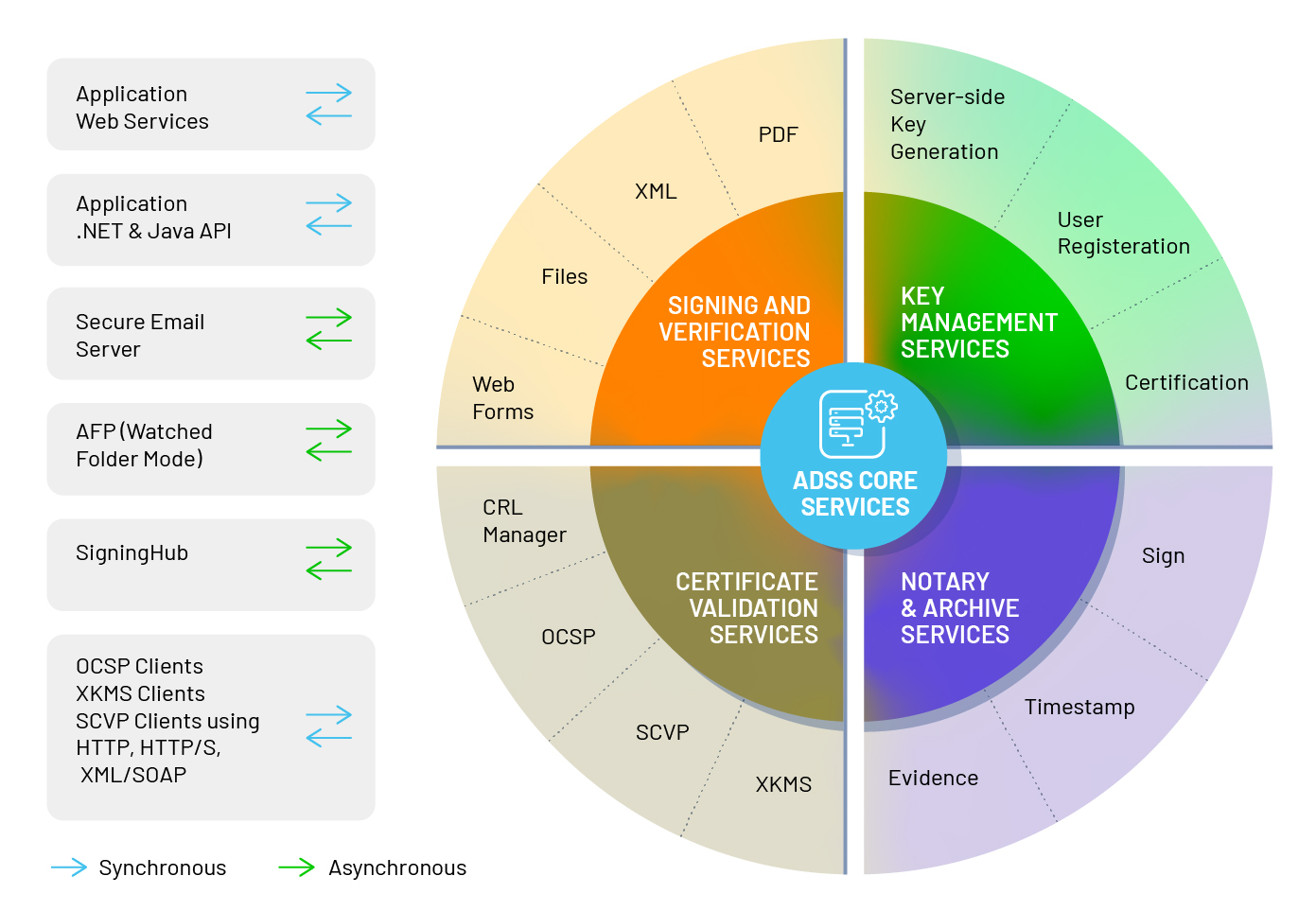 The following diagram provides an overview of the ADSS Server product architecture and available interfaces: