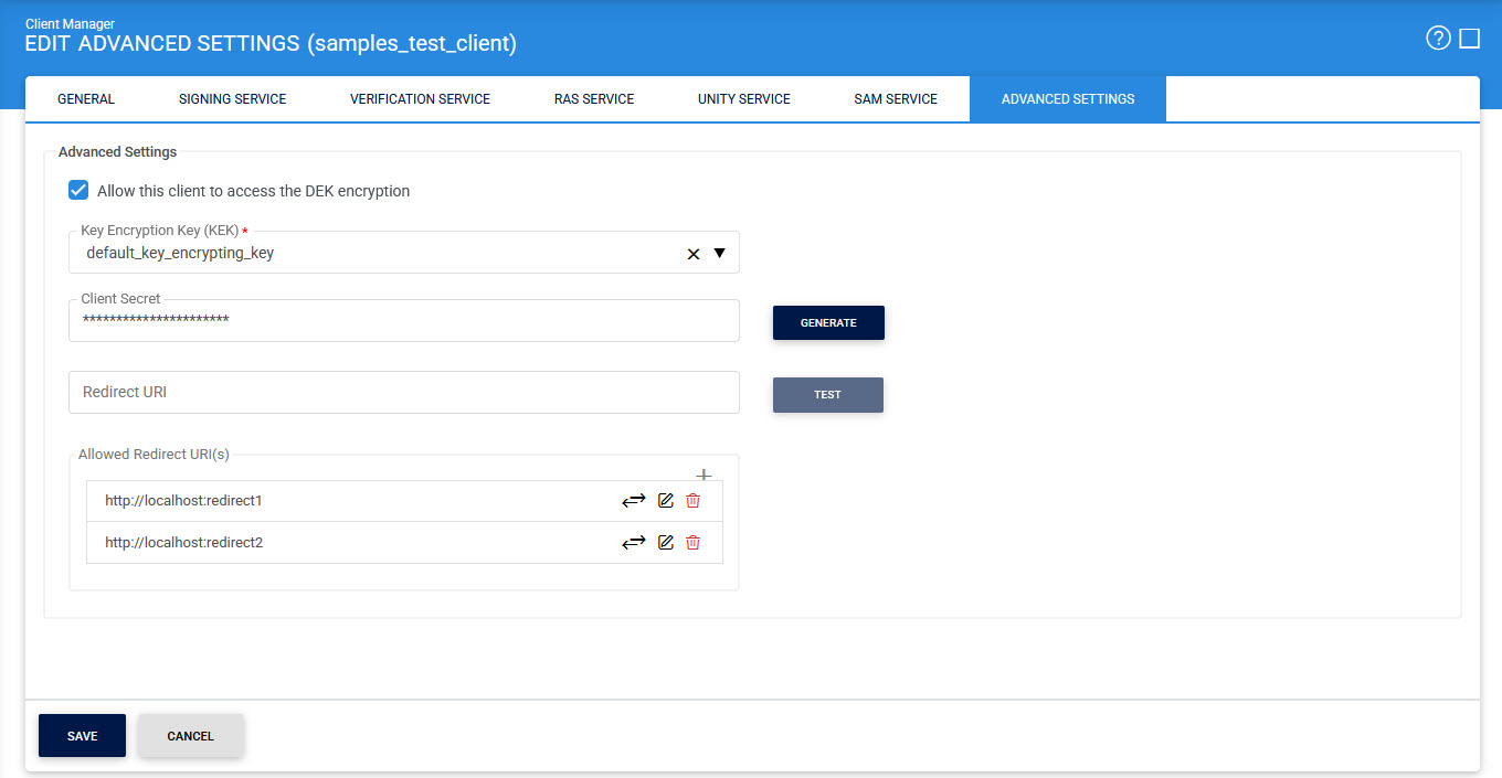 The following configurations related to Data Encryption Key (DEK) and client secret which can be configured within the Client Manager by clicking on the Advanced Settings tab.