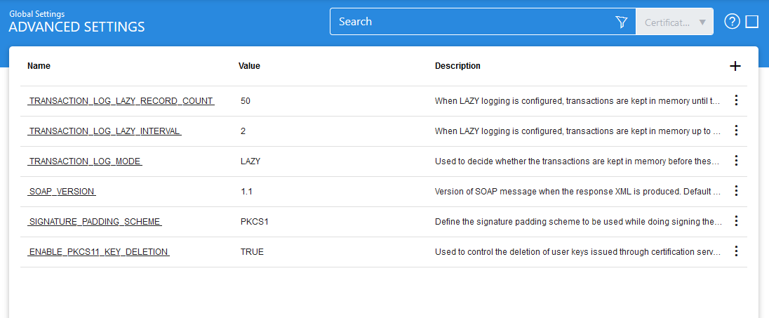 Clicking on Certification Service > Advanced Settings displays the following screen: