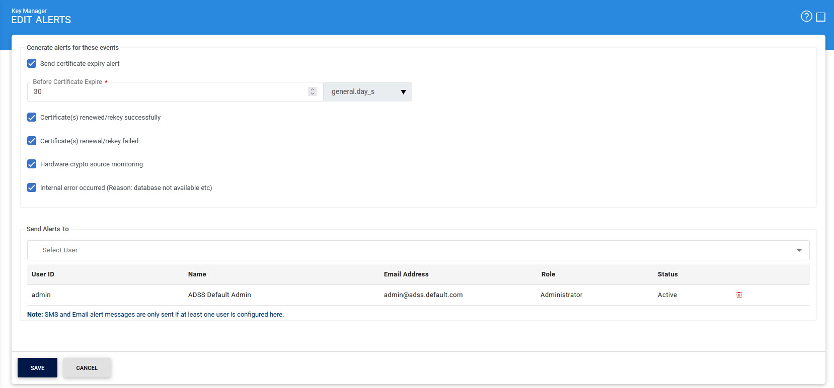 Key Manager can be configured to send email alerts to system users about various conditions. The following screen shows how such alerts can be configured: