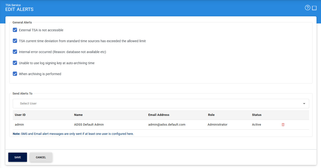When enabled, the ADSS TSA Service will send an alert to configured system operator(s) whenever it fails to communicate with an external TSA. |