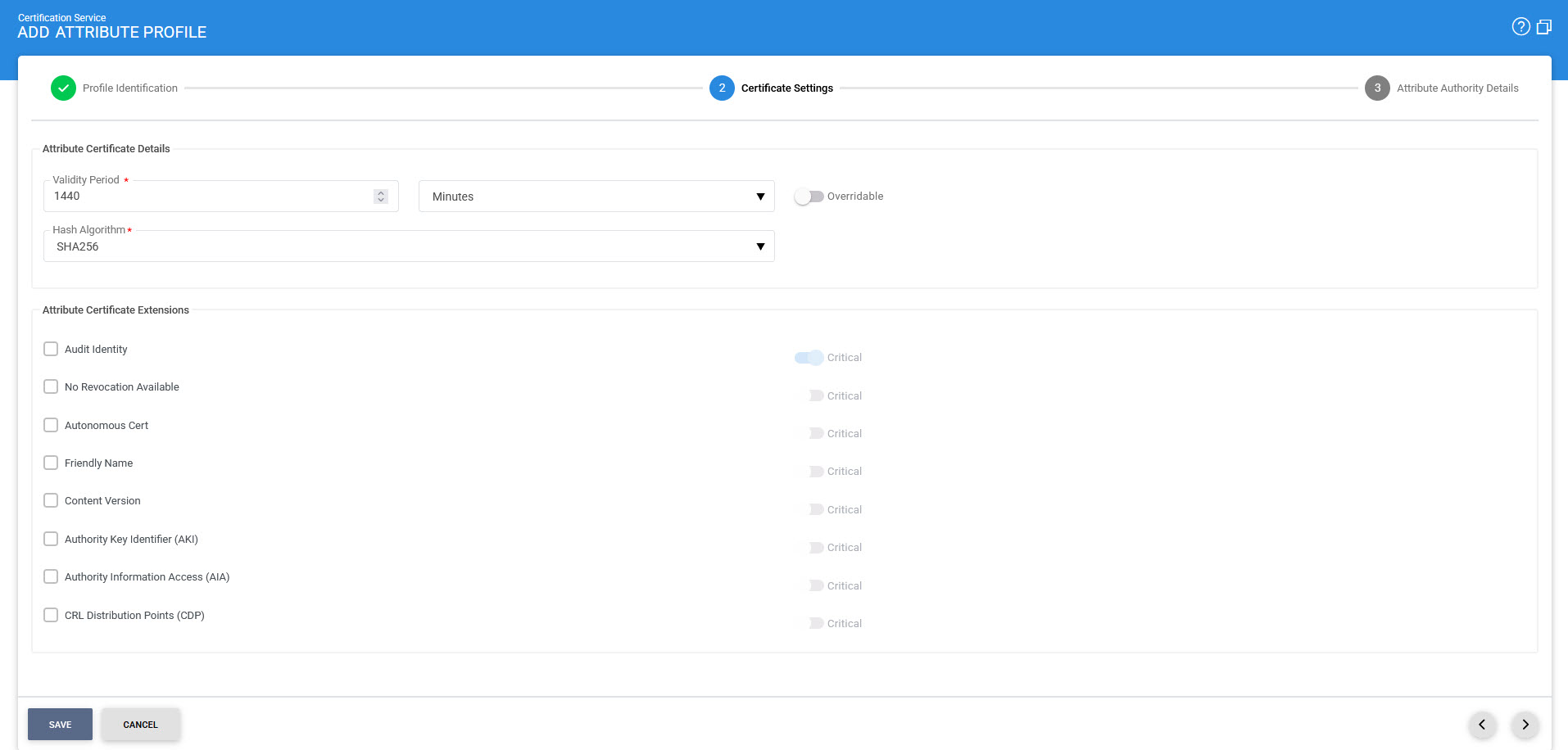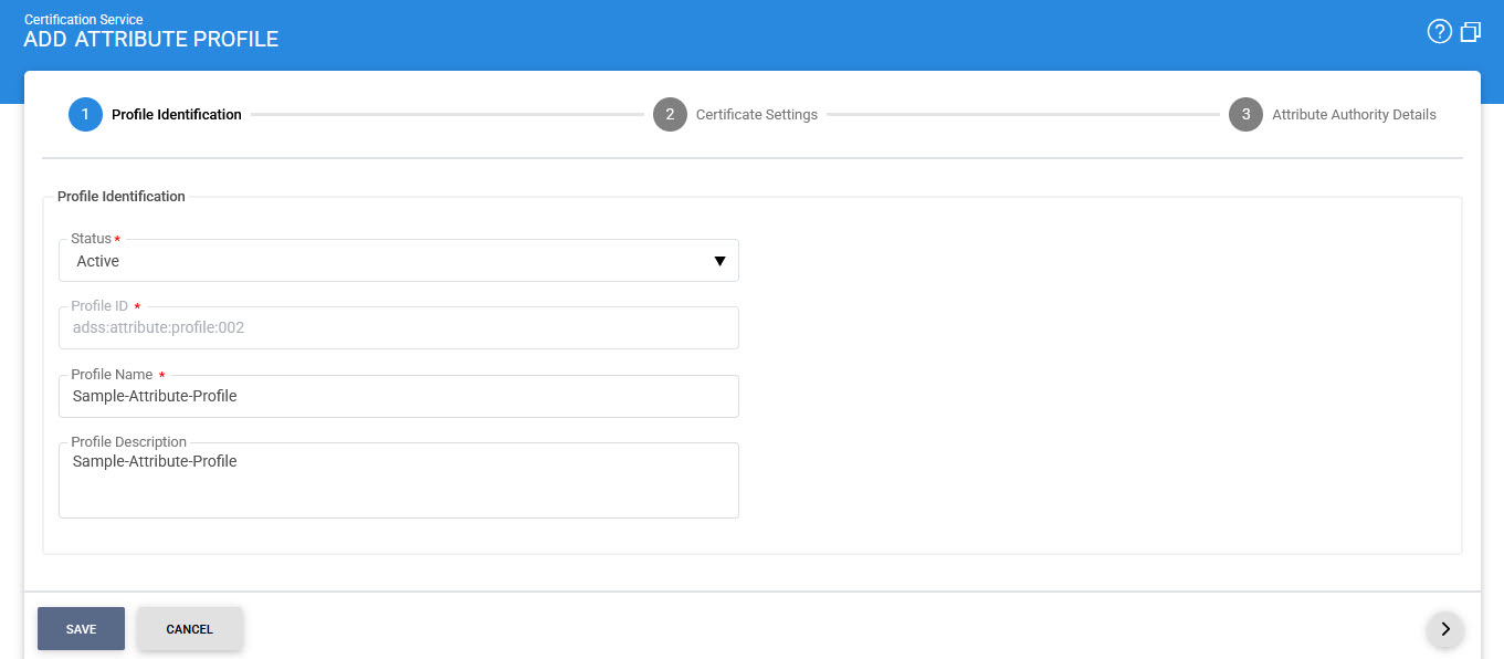 In this step you can create an attribute profile. An attribute profile is a set of parameters configured within the ADSS Certification Service which define characteristics of the attribute certificates (e.g. lifetime of the certificate along with certificate extensions etc) that will be generated by the service. The advantage of configuring a attribute profile on ADSS Server is that client applications do not need to pass these parameters within each service request message, but can simply refer to a particular configured attribute profile. ADSS Server allows the flexibility to override the profile attributes if specifically allowed within the profile settings.
