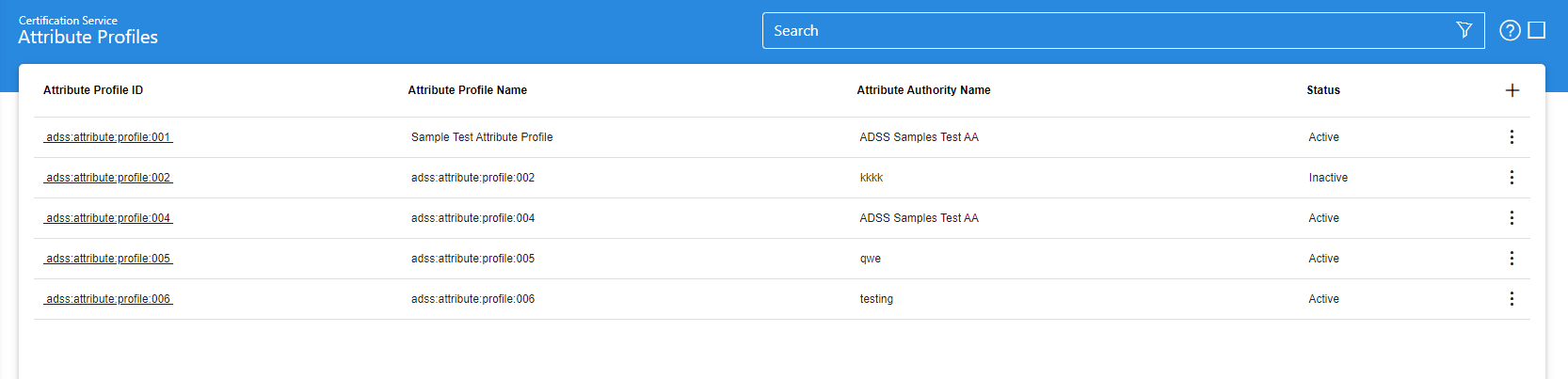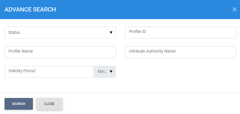 This helps to locate a particular type of attribute profile generated in the Certification Service. The profile can be searched based on Status, Profile ID, Profile Name, Attribute Authority Name, Validity Period. If a search is based on multiple values, then these will be combined together using the “AND” operand, and thus only records that meet all the criteria will be presented.