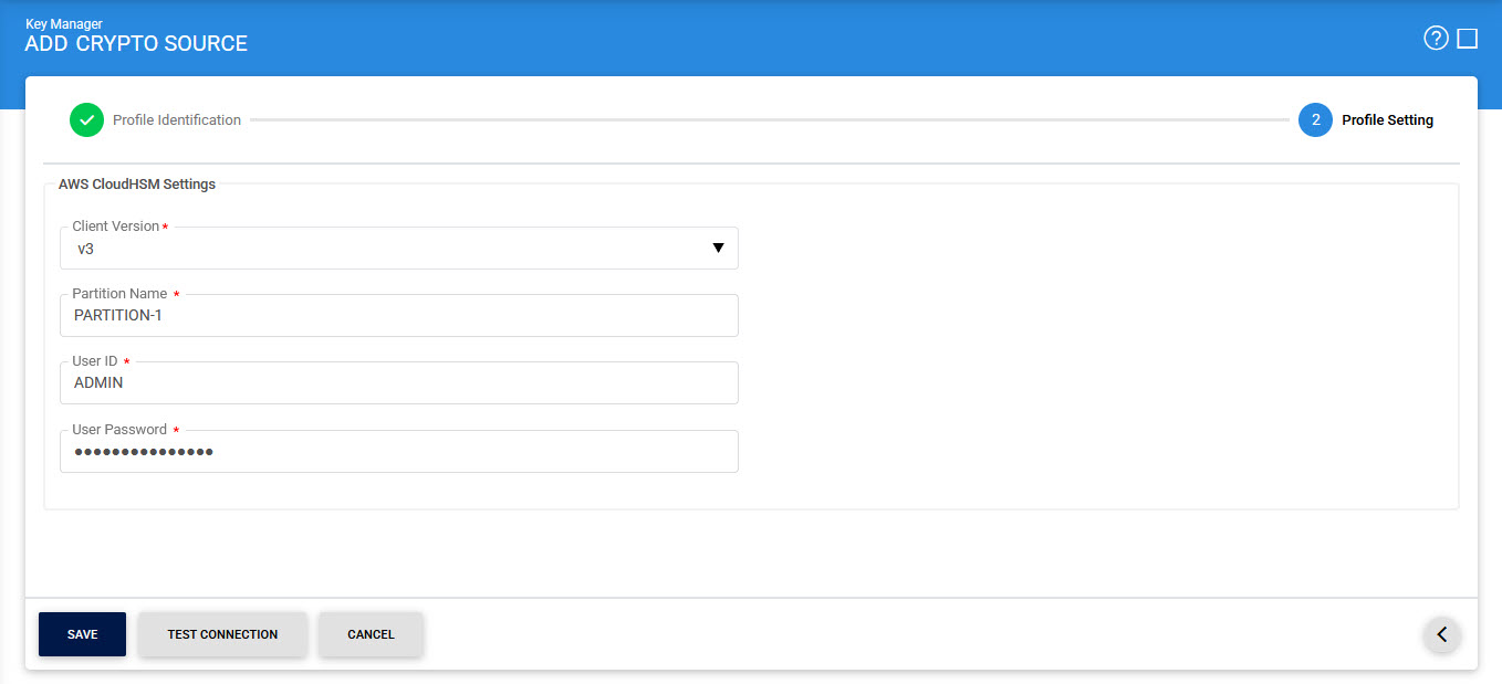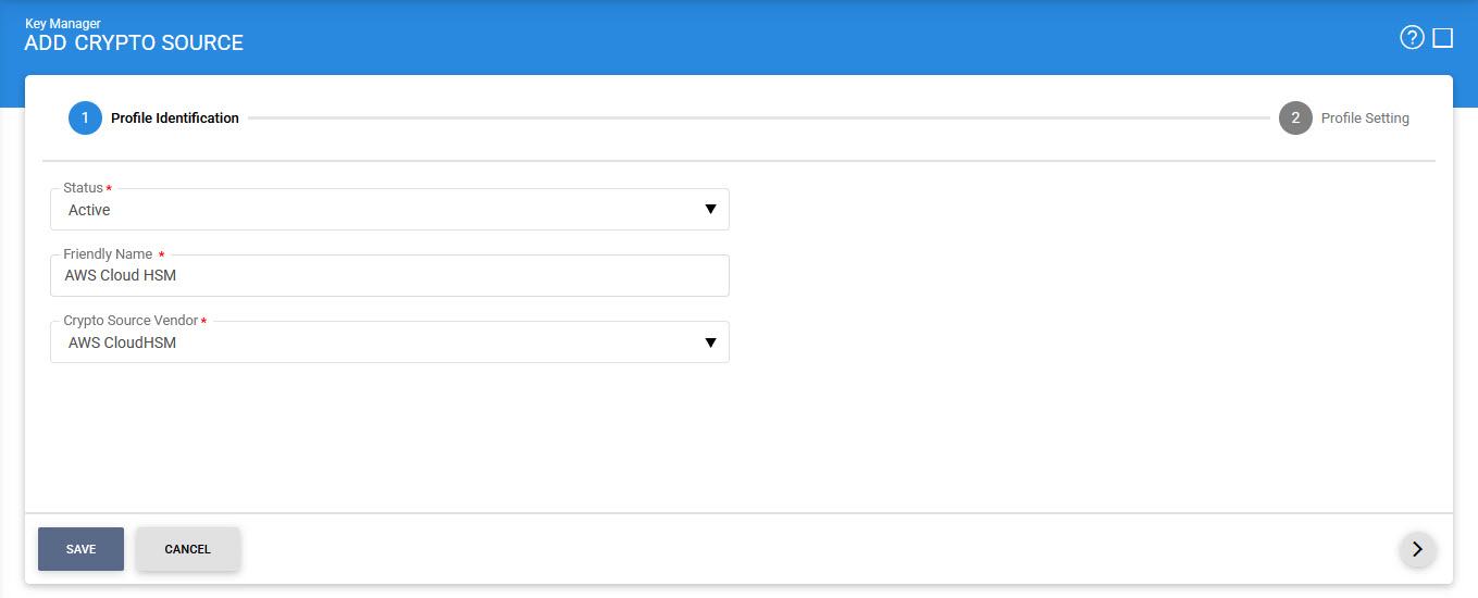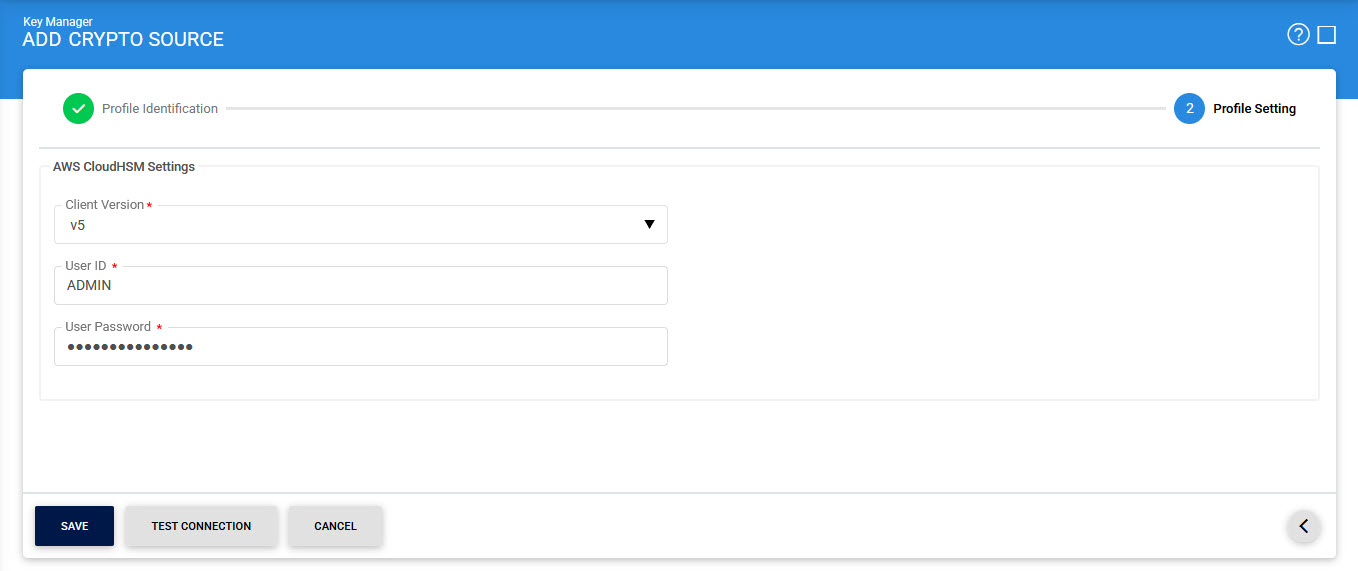 To generate a new AWS CloudHSM profile press the New button in the Crypto Source Screen and select AWS CloudHSM in Crypto Source Type drop down: