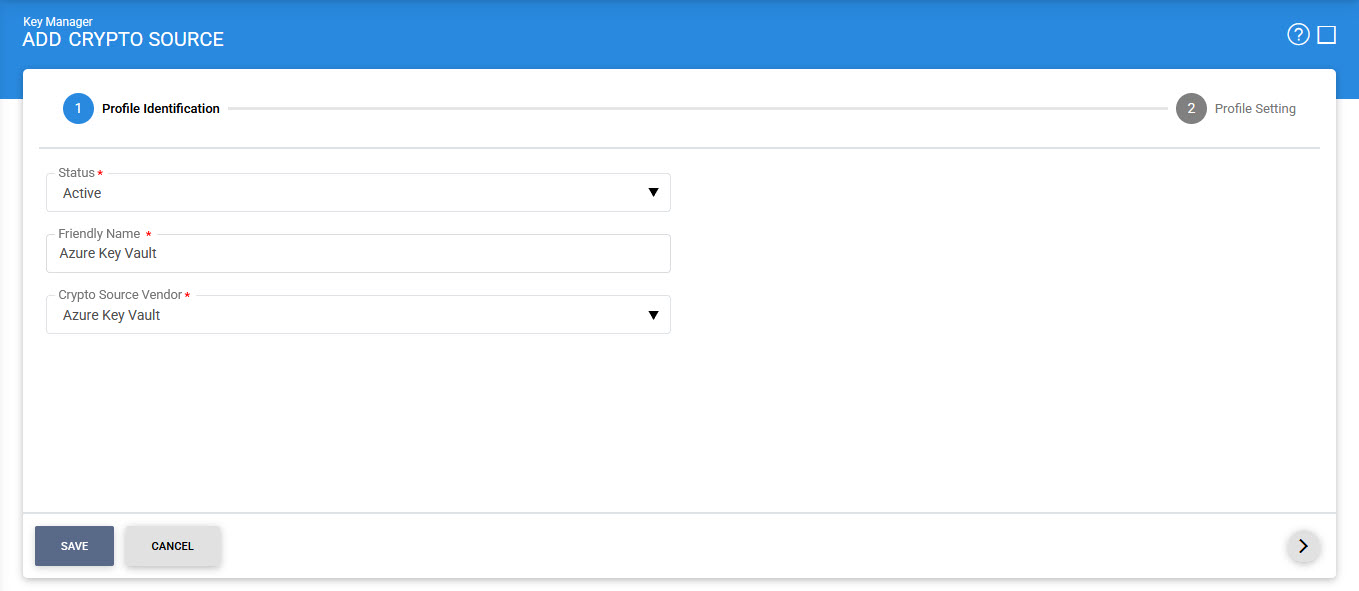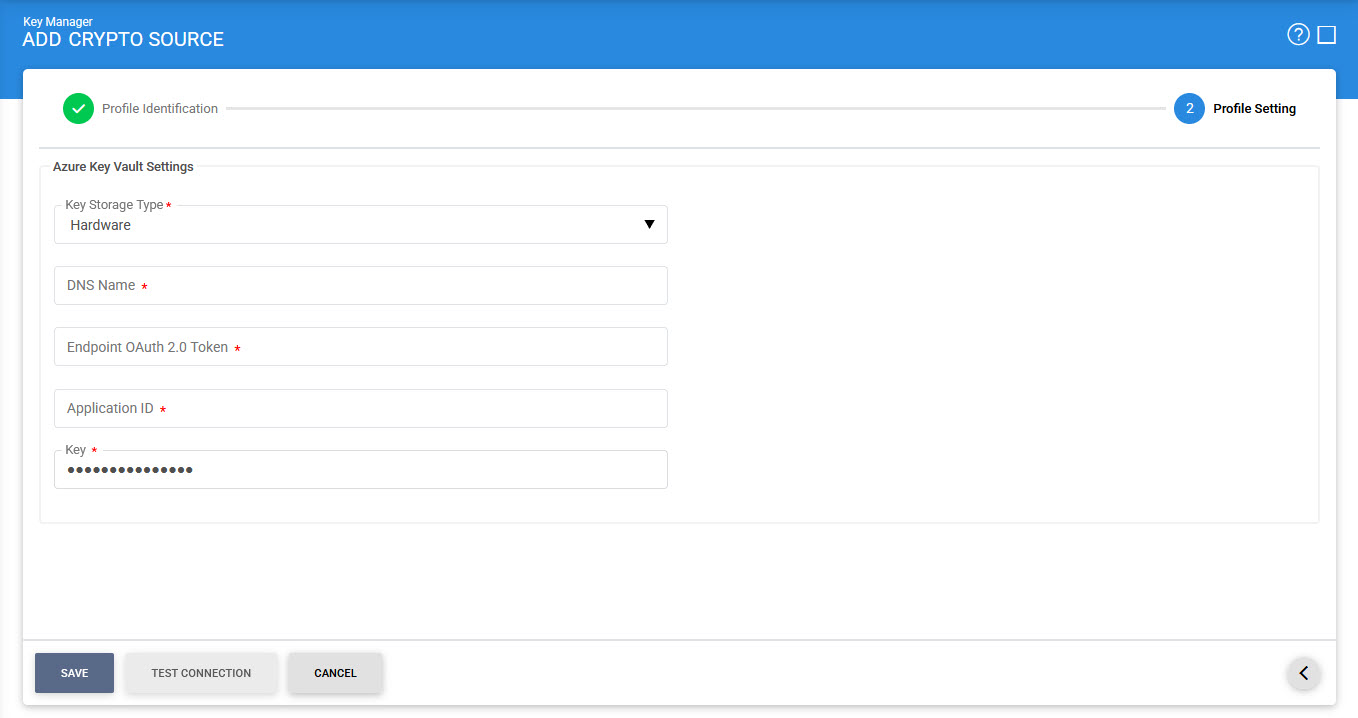 To generate a new Azure Key Vault profile press the '+' button in the Crypto Source Screen and select Azure Key Vault in Crypto Source Type drop down:
