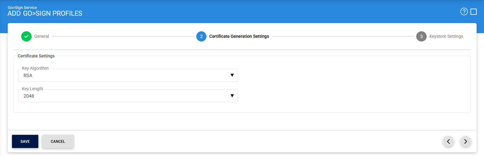 This page is used to configure the Certificate Generation Settings that will be generated in the Go>Sign Desktop.