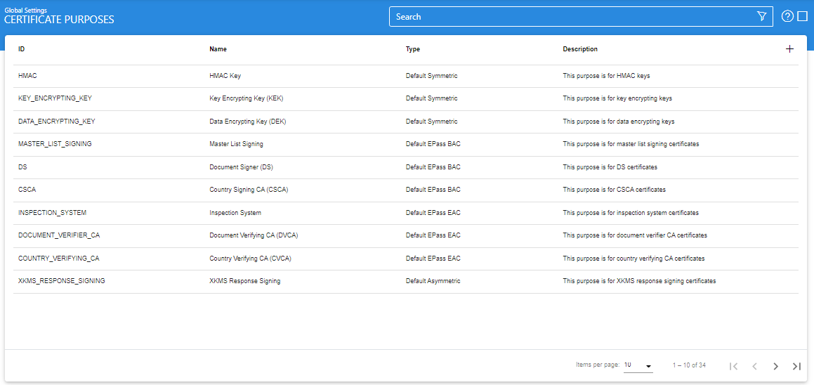 As mentioned in the screen above, a certificate purpose can be searched based upon Purpose ID, Purpose Name and Purpose Type. The Purpose Type drop-down includes the default certificates purposes like Default Asymmetric, Default Symmetric, Default EPass EAC and Default EPass BAC as well as user-defined custom certificate purposes. The user can search the required certificate purpose based on desired configurations.