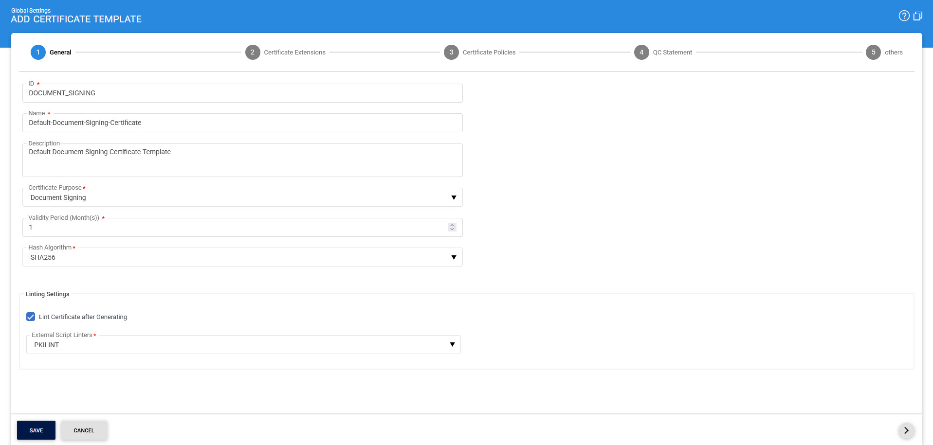 Clicking on the '+' button will lead you to the screen where the required information against the new certificate template can be filled. Following screen will be shown: