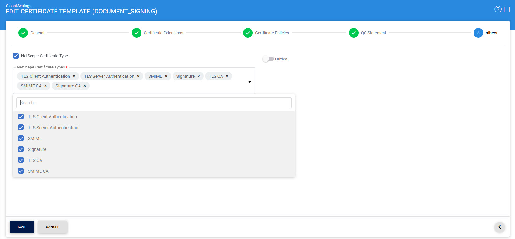 Here, the user can define the the NetScape Certificate Types from the drop-down field. Once done, click on the Save button in order to save the changes for new certificate template.