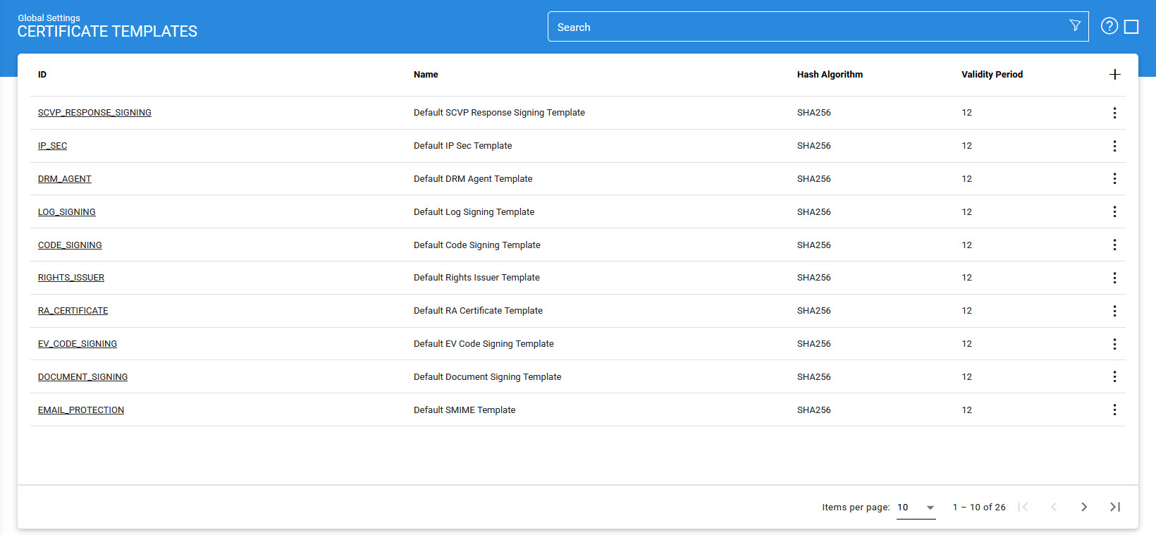 These templates define the profile of the certificates that will be issued by the ADSS Local CA (s) and ADSS Key Manager. Default templates exist for various key purposes. New templates can also be defined according to business needs.