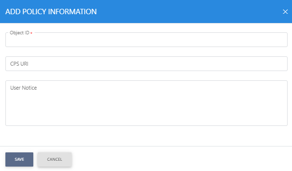 Here the user can define the required certificate policy in the certificate template. In order to define a certificate policy, click on the '+' button, it will open the below screen: