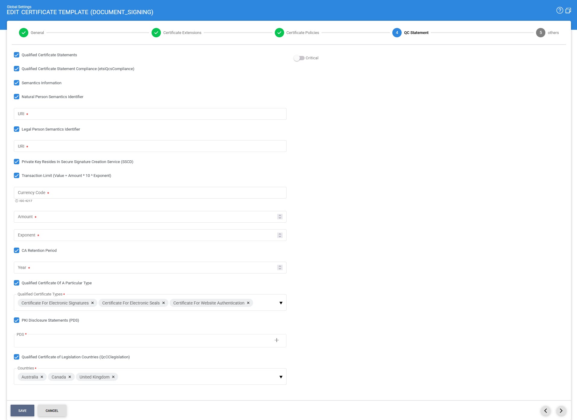 Defines unambiguous identification of the EU Qualified Certificate type of the end user for QES (Qualified Electronic Signatures) creation by means of OID in QCStatements in accordance with IETF RFC 3739 and especially with ETSI EN 319 412-1. This allows the configuration of various aspects of the ETSI Qualified Certificate profile statements, i.e. this is a qualified certificate, Semantics Information, PKI Disclosure Statements, transaction value limit, CA retention period and whether the private key held on a Secure Signature Creation Device (SSCD), typically an evaluated smart card that has achieved a particular security assurance level. Qualified Certificate Statement Compliance (etsiQcsCompliance): When this option is enabled, the etsiQcsCompliance extension (OID: 0.4.0.1862.1.1) is included in the issued certificate to indicate compliance with ETSI qualified certificate requirements. If the option is disabled, this extension is not added to the certificate. Defines an identifier about the semantics of data stored in the certificate i.e. whether the certificate is issued to a natural person or legal person:
