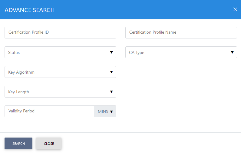 This helps to locate a particular type of certification profile generated in the Certification Service. The profile can be searched based on Status, Certificate Profile ID, Certificate Profile Name, CA Type, Key Algorithm, Key Length, Security Level and Validity Period. The Security Level field will only be available if ML-DSA or ML-KEM is selected in the Algorithm field.