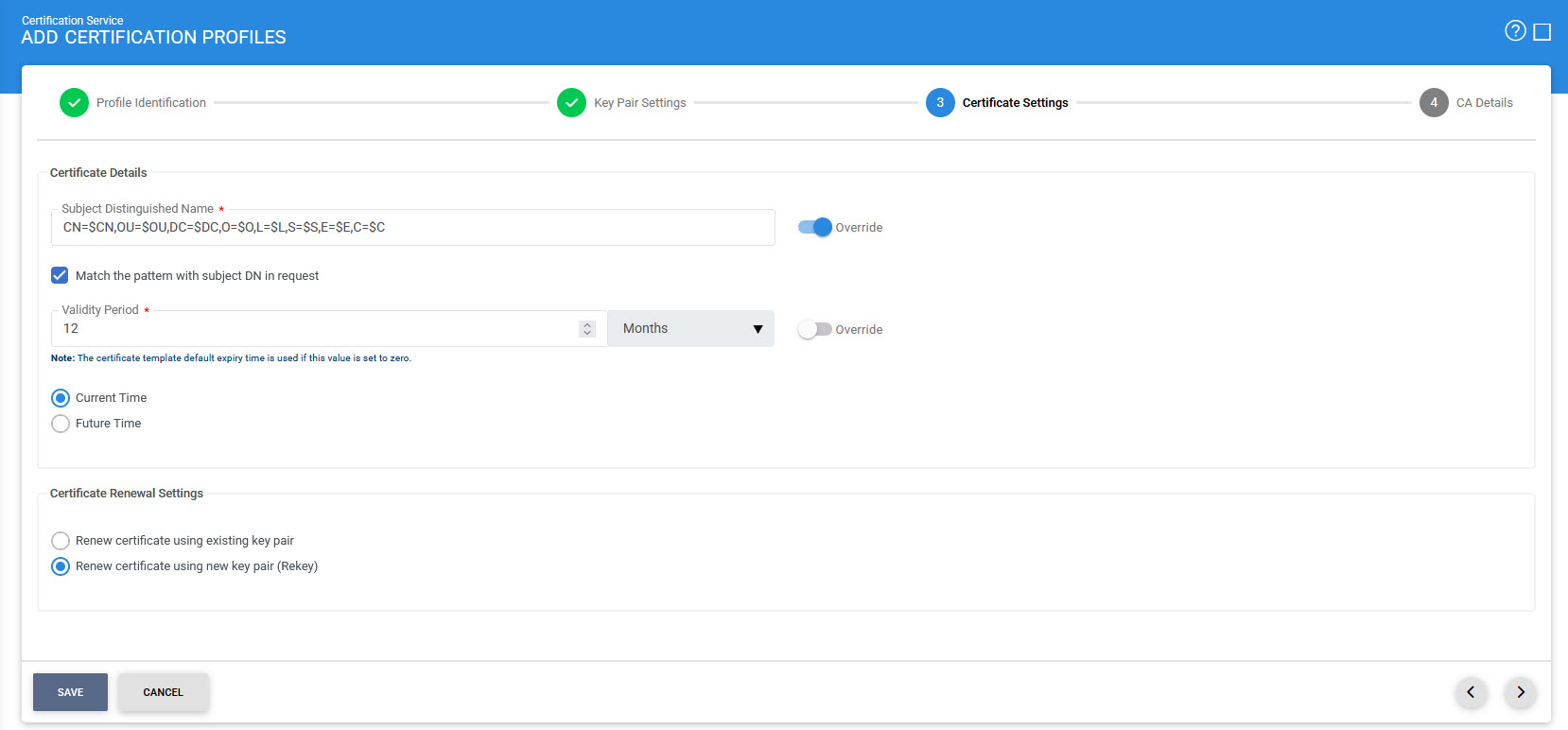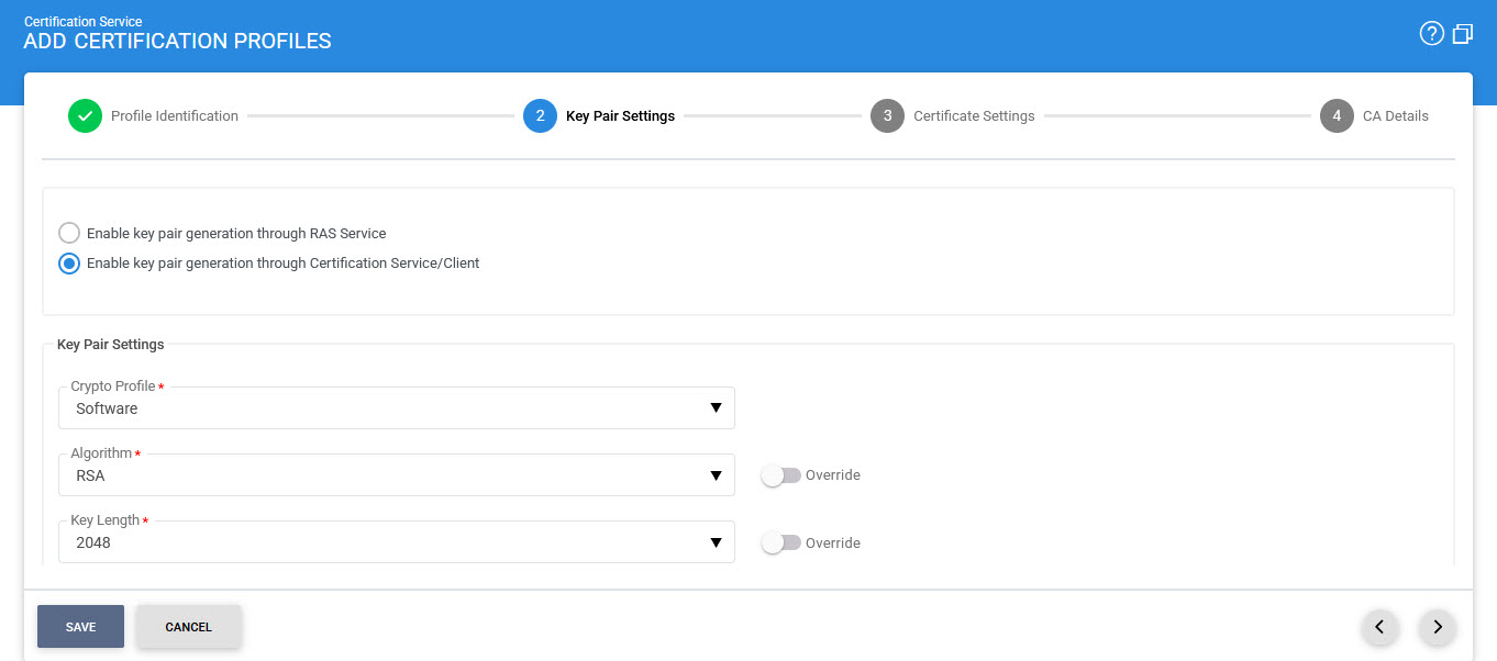 The second step is to enable the required key pair settings in Certification Profile. See the below image: