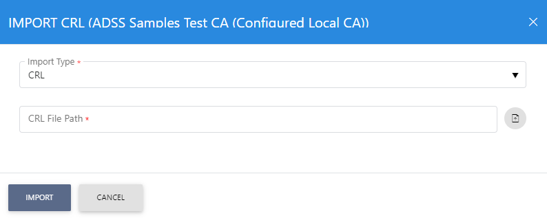 Clicking on the vertical ellipsis in the first column display the option to 'Import CRL' or 'Delete All CRLs'. Selecting the Import CRL option displays the following screen: