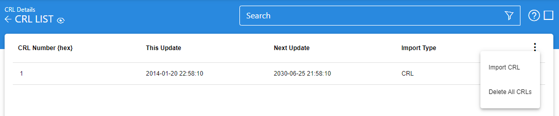 This drop-down menu option allows for the import of current (full or segmented or partitioned) or archived CRLs. user can import DER, Base64 or PEM encoded CRL. The CRLs that can be imported include: