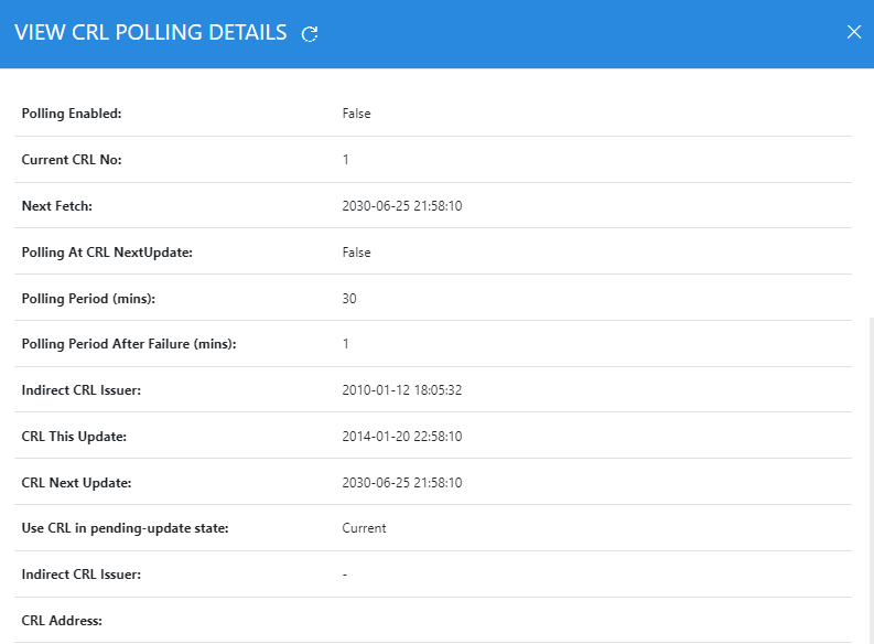 In the above screen, clicking on the View CRL Polling Details button will show the following screen of CRL polling details for the selected CA: