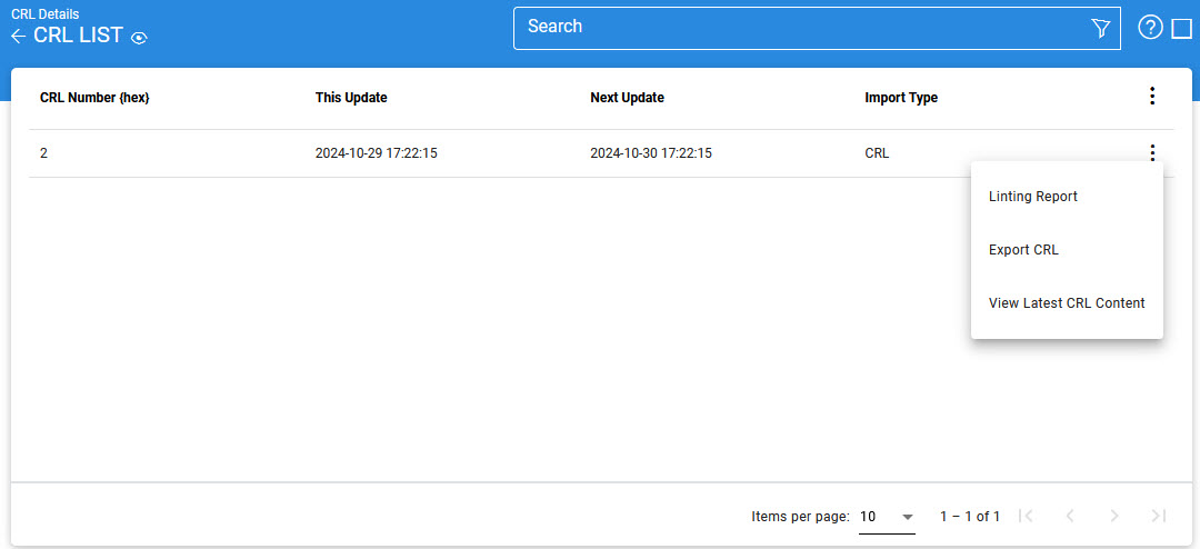 Clicking on the vertical ellipsis for the selected CRL displays the following screen: