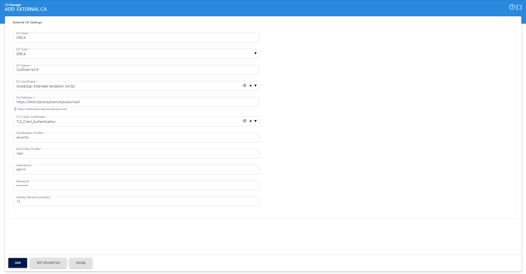 To configure the EJBCA as an external CA select the "EJBCA" from the "CA Type" drop down. The following page will be shown to configure the EJBCA: