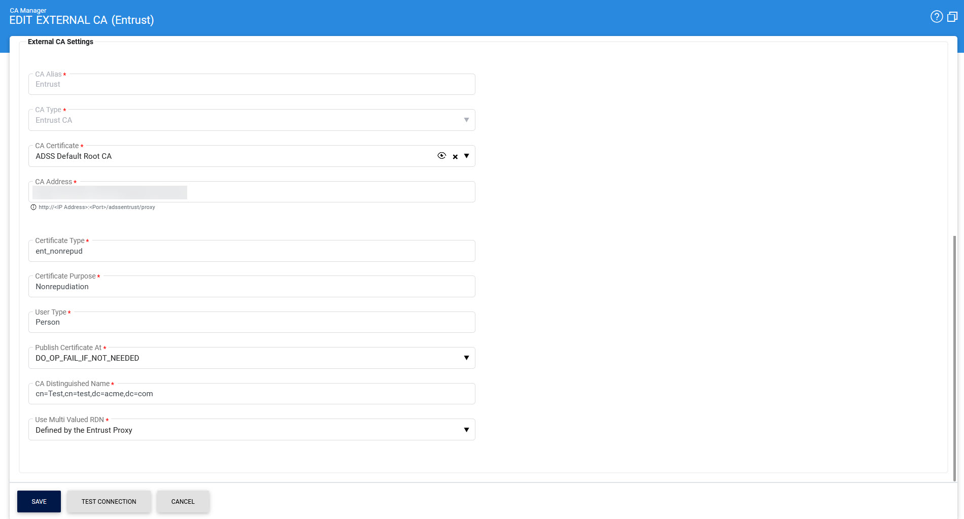 To configure Entrust Authority Security Manager as an External CA, select the Entrust CA option from the CA Type drop down. These options will be shown:
