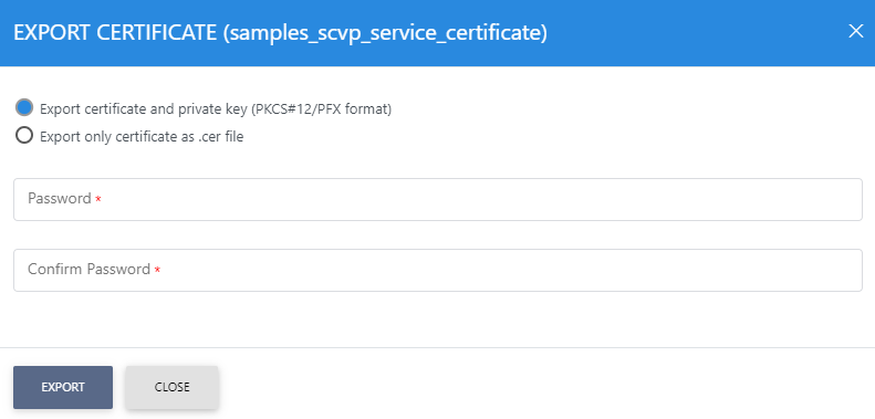Decide if you wish to export the private key and the associated certificate as a PKCS#12/PFX file or just export the certificate as a .CER file. For the former a password needs to be supplied to protect the keys. Note the key must have been marked as “exportable” when it was first generated by or imported into ADSS Server otherwise export of the private key will not be allowed.