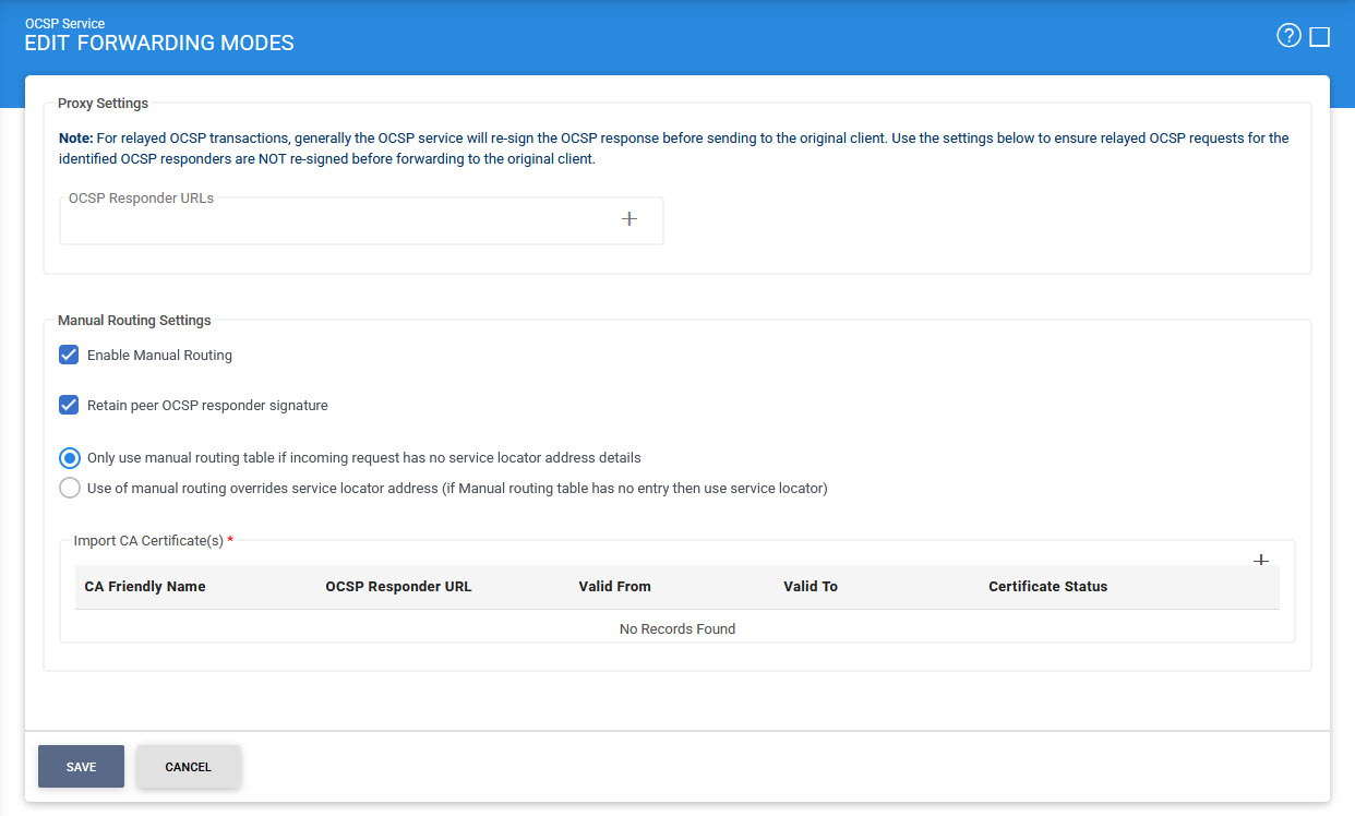 The OCSP Service enables a manual routing table to be created for certificates, that do not contain a Service locator extension in the OCSP request. This is done by identifying the CA and manually configuring an address for its OCSP responder. When an OCSP request is seen for a certificate issued by this CA, the OCSP service will forward the request to the identified peer OCSP responder.