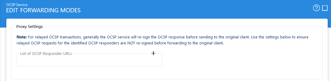 For relayed OCSP transactions, generally the OCSP service will re-sign the OCSP response before sending the response to the calling client. Use these settings to ensure relayed OCSP requests for the configured OCSP Responder URLs are NOT re-signed before responding to the calling client:
