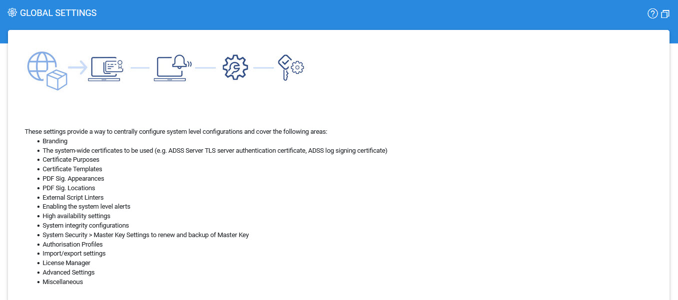 This module is used to configure ADSS Server settings that are used within multiple ADSS modules. Following screen shows the Global Settings module home page, and this lists the areas managed in this module: