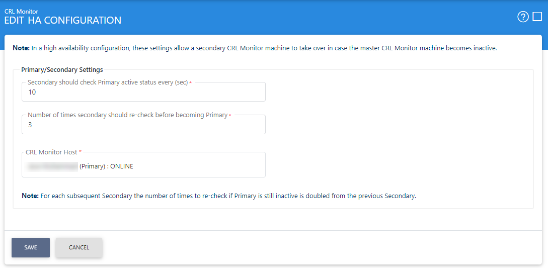 In a load-balanced configuration there are two or more ADSS Server instances handling front-end services such as the OCSP Service. The background task of CRL polling, i.e. retrieving CRLs from online repositories should be performed by only one instance of ADSS Server. This is because if several ADSS Server instances were polling for CRLs they would simultaneously download and attempt to process the same CRL, which is obviously pointless. However this leads to a potential situation where the ADSS instance which is retrieving CRLs (referred to as the “Primary”) can become a single point of failure. If this instance fails then polling for CRLs will not be conducted by any other instance. To overcome this issue, ADSS CRL Monitor implements a high availability option such that if the Primary ADSS Server instance fails (e.g. the server fails), then another ADSS Server can automatically promote itself to Primary and take over the responsibility for CRL polling.