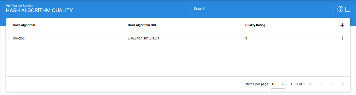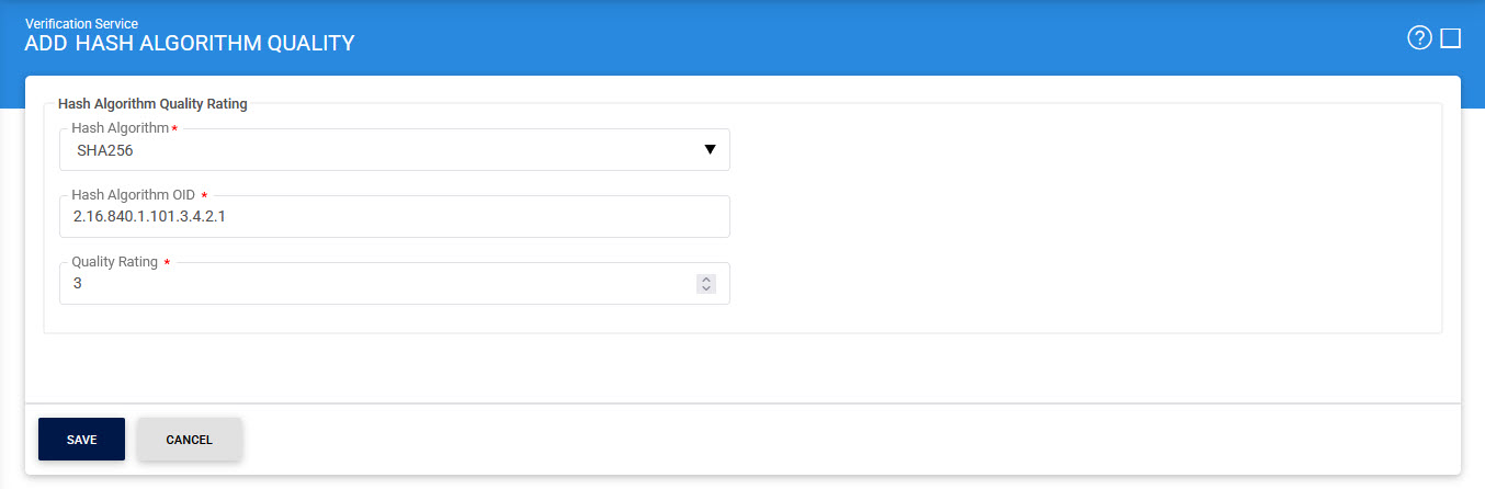 The above table shows a list of already configured Hash algorithm quality ratings. You can add quality ratings for more algorithms by clicking the '+' button and entering the details as shown below: