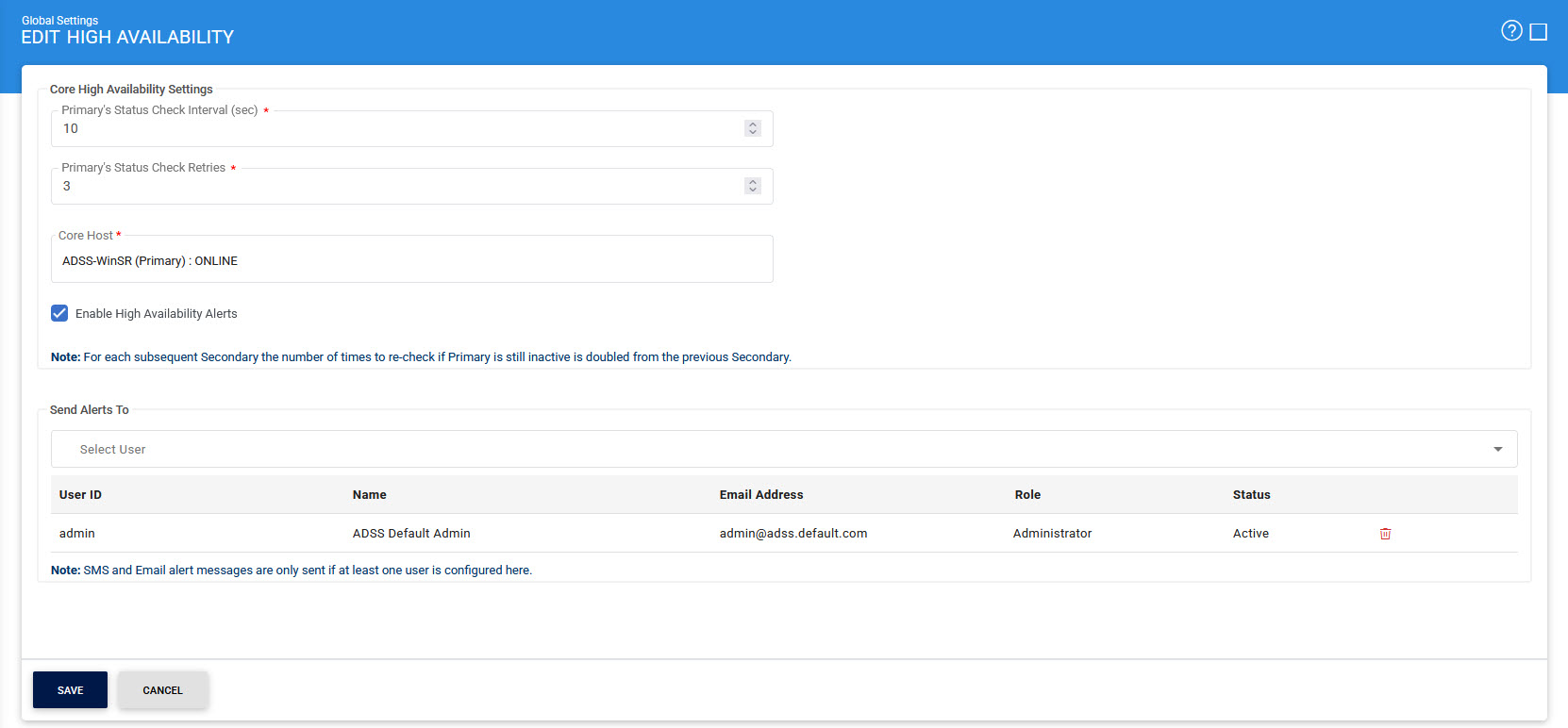 In a high availability configuration two or more ADSS Core instances can be installed with shared database so that if an instance is crashed, the other instance may take place and routine operations are not disturbed. ADSS Server Core instance performs many processes like certificate expiry alerts, certificate renewal, auto archiving, file synchronization etc. Secondary core instances will watch the primary core instance. If primary ADSS Server Core instance crashes, then these tasks will be performed by secondary core instance. All ADSS Server instances use the same database and use this to check what their status is. The first installed instance of ADSS Server console automatically becomes the Master and all subsequent instances act as Slaves.