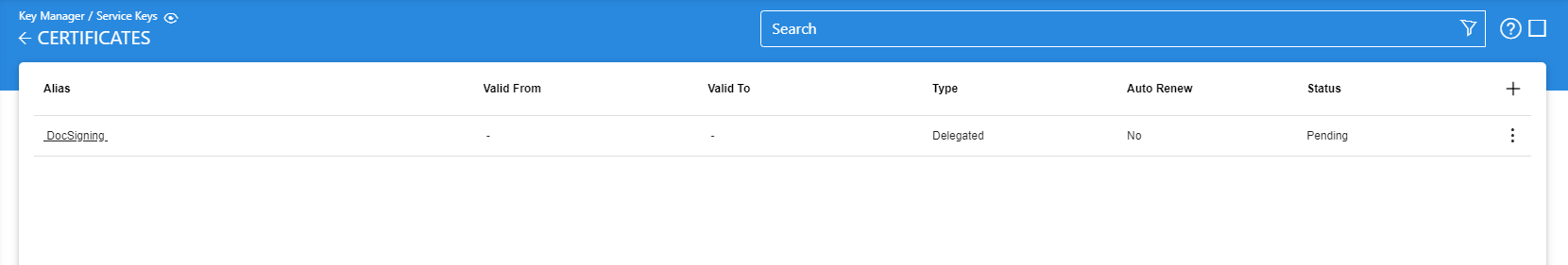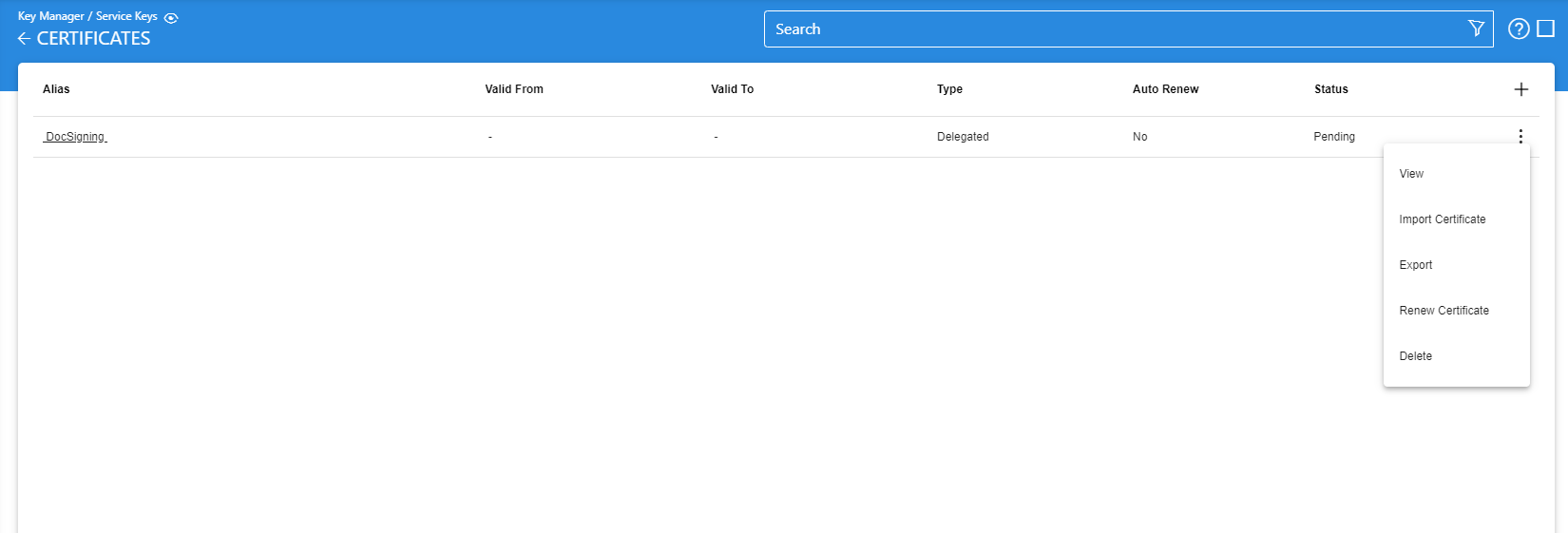 Certificates are only imported in Key Manager when PKCS#10 is generated in ADSS Server and certified externally to use this key for different cryptographic operations. When a PKCS#10 is generated using a service key, it is shown in the certificate list with Pending status.