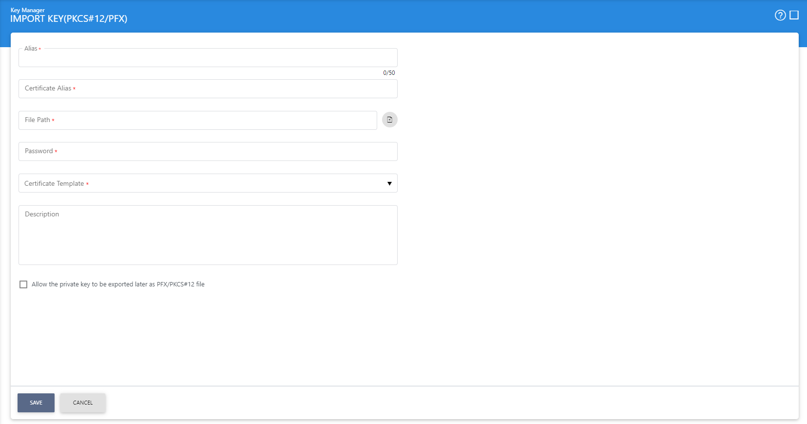 - A certificate alias needs to be assigned (since the PKCS#12/PFX will also contain a certificate as well as the key pair). The certificate alias must be unique within the Key Manager module.