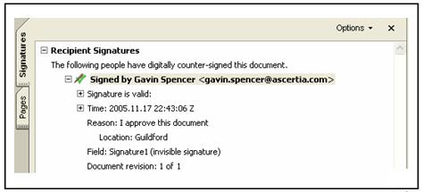 Invisible PDF signatures do not produce an appearance on the PDF document. Such signatures are useful where the actual content of the document should not be disturbed by the signing process. The existence of such signatures is still shown very clearly in PDF viewers such as PDF Sign&Seal, Go>Sign Applet and in Adobe® Acrobat® Reader:
