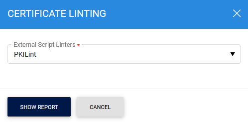To view the linting report for a selected certificate, click on the vertical ellipsis next to the row on the main screen and select the Linting Report option. This action will open a new screen where you can choose the desired External Script Linter from the drop-down list configured under Global Settings > External Script Linters: