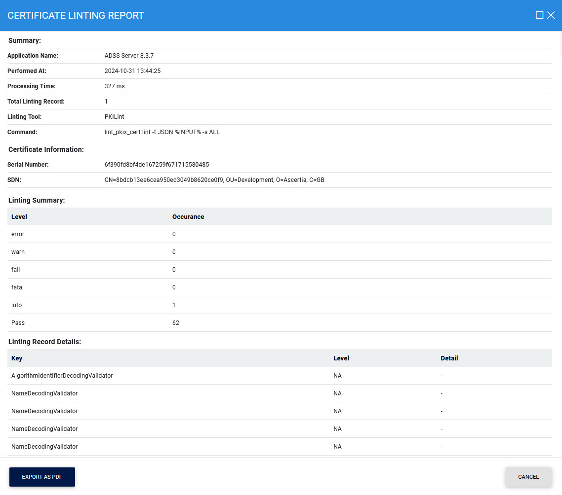 After selecting the linter, click Show Report to display the linting details of the certificate: