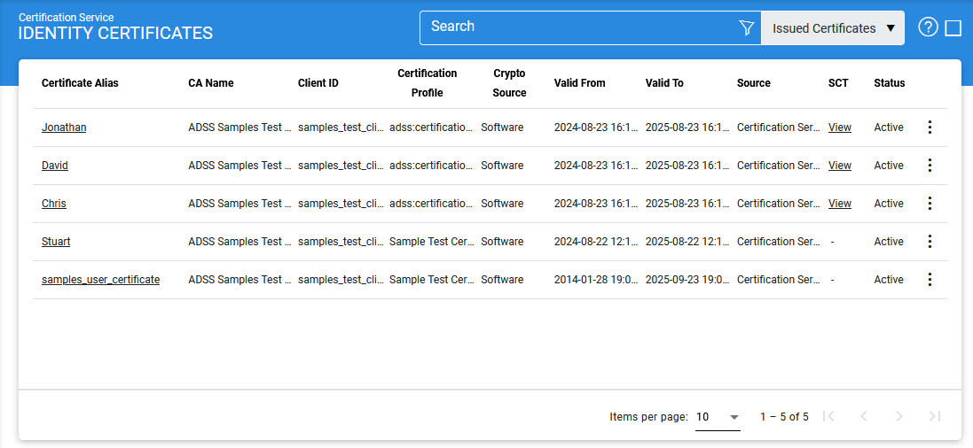 The Issued Certificates navigation button within the ADSS Certification Service allows you to view all certificates generated through the service interface: