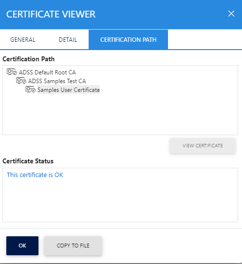 Here the user can view the certificate path as well as certificate status (active or revoked).