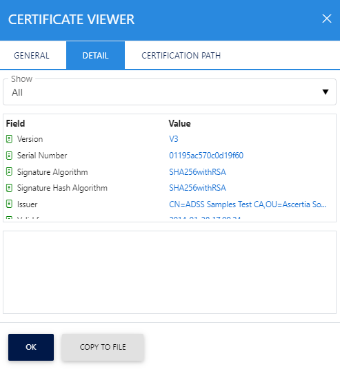 Here the user can view all the configurational details related to the selected certificate. Clicking on the Certification Path displays the following screen: