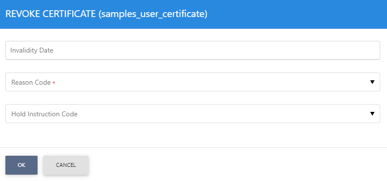 Clicking on the vertical ellipsis at the end of the row will show the option to Revoke the certificate. Clicking on the Revoke button will show the following screen where invalidity date, revocation code and hold instruction code can be provided before revoking the certificate: