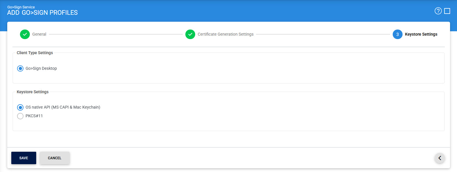 This page is used to configure the Key Store Settings where the key will be stored once generated through Go>Sign Desktop.