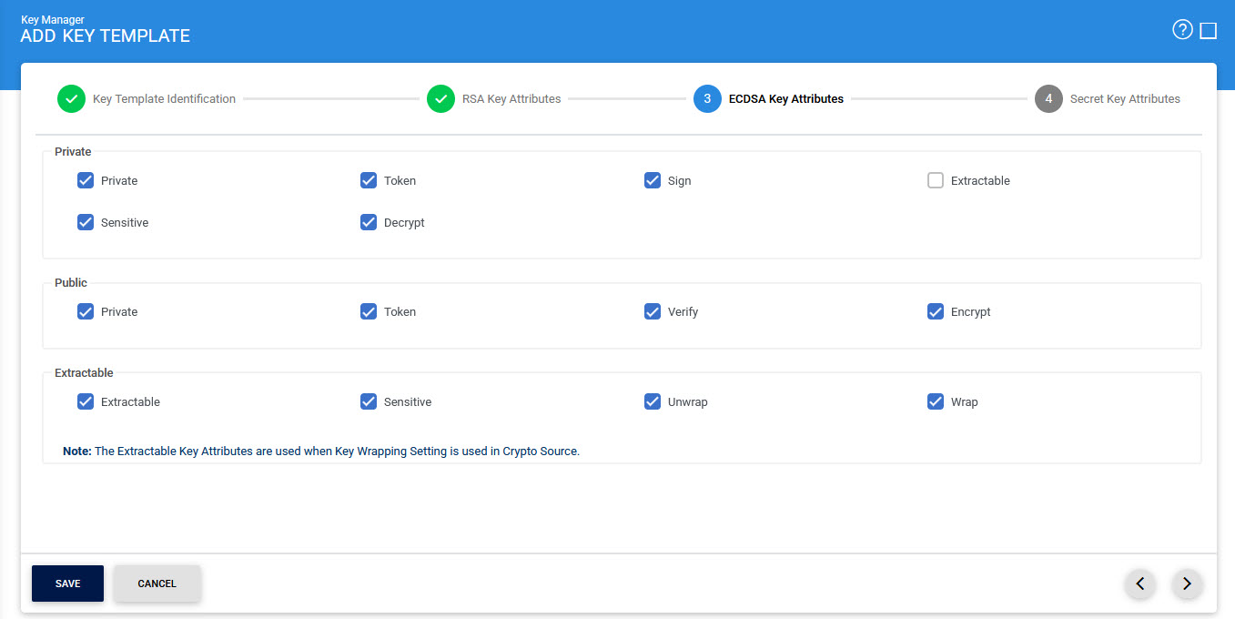 These attributes are used and defined when key wrapping is enabled for static and dynamic KEK generation. The type of key attribute that can be configured for extractable key includes: Extractable, Sensitive, Wrap, Unwrap and Token.