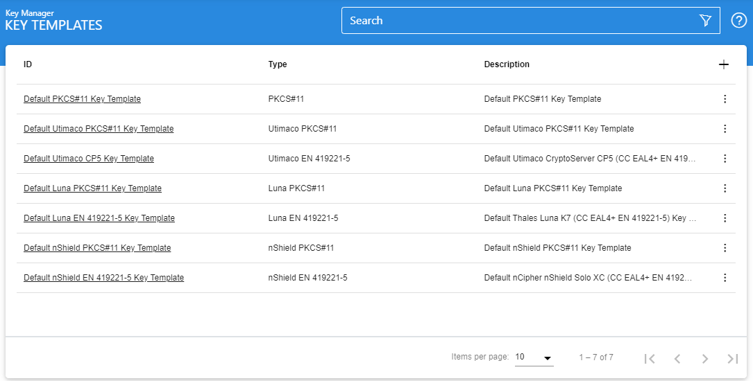 As mentioned in the screen above, a Key Template can be searched based upon Template Type and Template ID. The Template Type drop-down includes the default crypto source vendors like Utimaco, Thales Safenet, nCipher nShield, Utimaco CP5 CC EAL4+ EN419221-5, Thales Luna K7 (CC EAL4+ EN 419221-5), nCipher nShield Solo X (CC EAL4+ EN 419122-5) and other crypto source vendors. The user can search the required Key Template based on desired configurations.